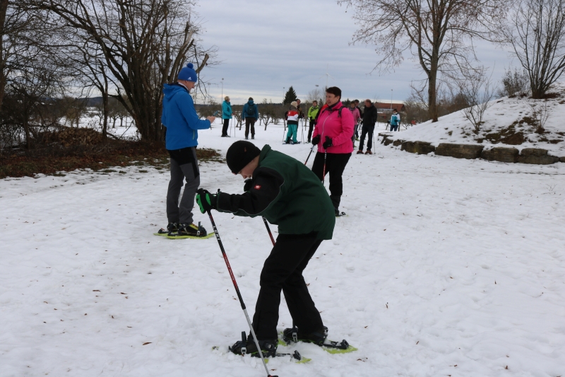 | Rund sechzig Teilnehmer nahmen an der geführten Schneeschuhwanderung rund um den Ort Dürrenmettstetten teil. Dabei hatte der Natur- und Wanderverein gerade noch Glück mit dem Wetter: Zwar nass aber ausreichend Schnee lag da, um den Freizeitsport durch eine winterliche Landschaft zu ermöglichen. Organisatorin Mirjam Kirschbaum hatte Schneeschuhe und Stöcke über MB Outdoor Sports Kniebis organisiert, die von den Teilnehmern ausgeliehen werden konnten. Ein Guide gab eine Einweisung in die Handhabung, dann konnte die Gruppe, darunter viele Auswärtige, vom Startpunkt Aussichtsturm los ziehen. Die Wanderer hielten sich weitgehend an die ausgewiesene D1-Strecke, den Panoramaweg, der rund elf Kilometer über „Straubenegert“, „Breite“, „Stangenacker“, „Hohe Tannen“ und zurück über das „Kugelwälde“ führte. Der Abschluss fand im Hiddehockerheim statt, wo eine heiße Suppe auf die Teilnehmer wartete. |