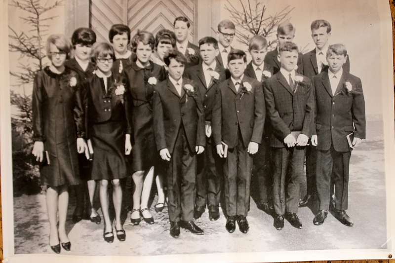 | Die goldenen Konfirmanden, von links: Liselotte Lampprecht, Heide Kraus, Karl Haller, Irene Trick, Gisela Lehmann, Fritz Mayer, Rolf Frey, Renate Trautwein, Gisela Rausch, Wolfgang Baumann (hinten), Egbert Engelhardt (vorne), Ernst Steinwand, Beate Frey, Udo Huß, Walter Bippus und Otto Maier. |