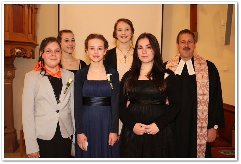 | Die Konfirmandinnen mit Pfarrer Wolfgang Müller, von links: Sophia Müller, Mailin Kurtz, Leona Häußermann, Sharleen Wolf, Anna Dölker. |