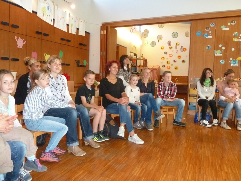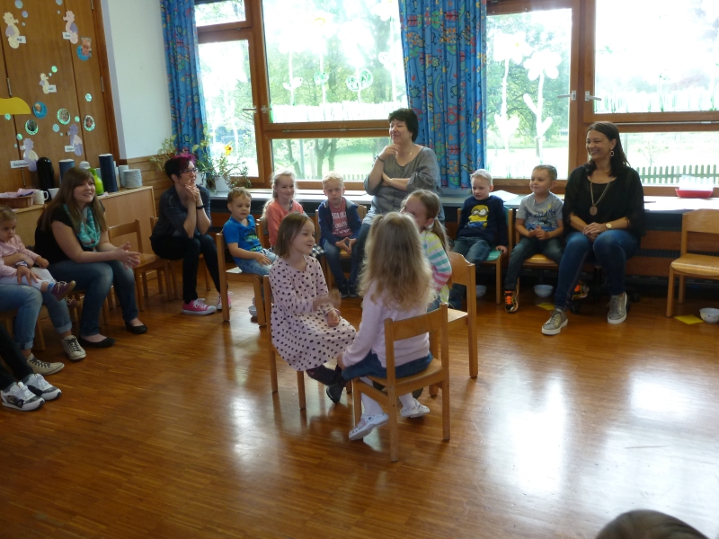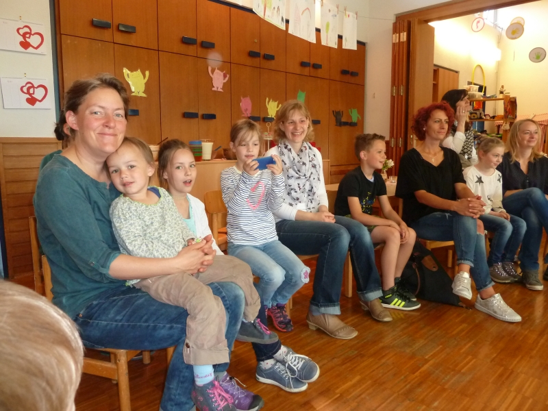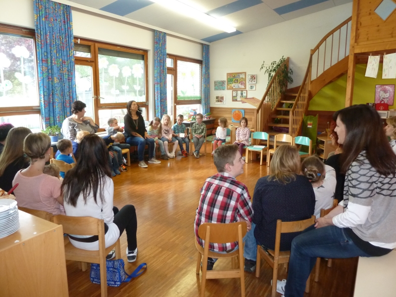 | Die Regenbogenkindergarten-Kinder überraschten ihre Mütter beim Muttertags-Frühstück im Kindergarten mit dem Lied „Meine Mami“ und einem Rätselspiel „Ich habe mir etwas ausgedacht, nun ratet mal was die Mama macht“. Die Vorschüler stellten dazu pantomimisch nach, was für vielfältige Aufgaben die Mama alles im Haushalt erledigt, so zum Beispiel Wäsche waschen, bügeln und kochen. Eine spaßige Angelegenheit, bei der auch die Geschwister mit raten durften. Passend zum gemeinsamen Frühstück, das die Erzieherinnen hergerichtet hatten, übergaben die Kinder ihren Müttern eine selbstbemalte Müslischüssel als Muttertagsgeschenk. |
