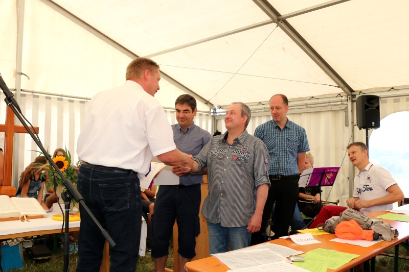 | Im Rahmen des „Gottesdienstes im Grünen“, der im Zelt anlässlich des Bauernmarktes gefeiert wurde, konnte Bezirksposaunenwart Daniel Bleibel Wolfgang Kurtz und Otto Kraft für 40 Jahre Bläserdienst im Posaunenchor würdigen. Er überreichte beiden eine Urkunde mit Grüßen von Landesposaunenwart Hans-Ulrich Nonnenmann. Darin steht „Es ist eine der schönsten Aufgaben in der Gemeinde, Gott zu loben und anbeten“. Verbunden mit seinem Dank übergab er den langjährigen Posaunisten jeweils zusätzlich die goldene Anstecknadel. |