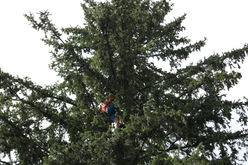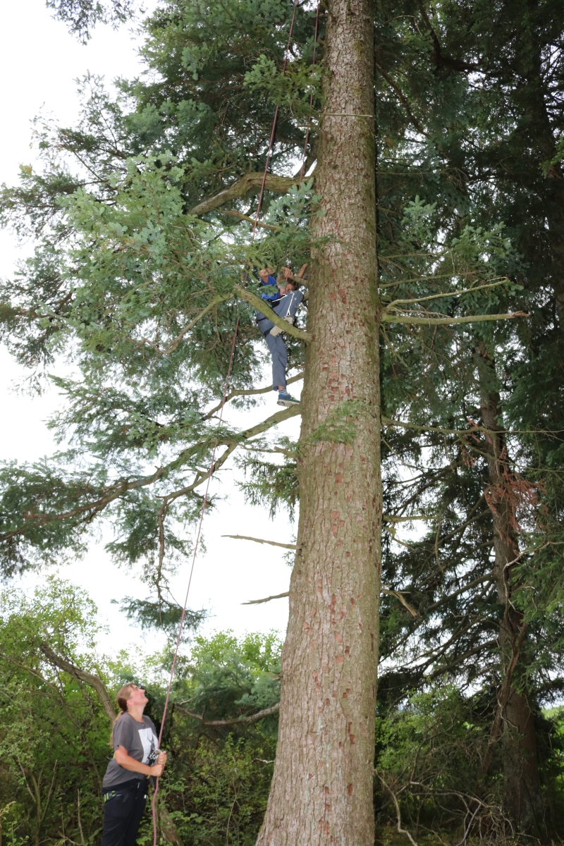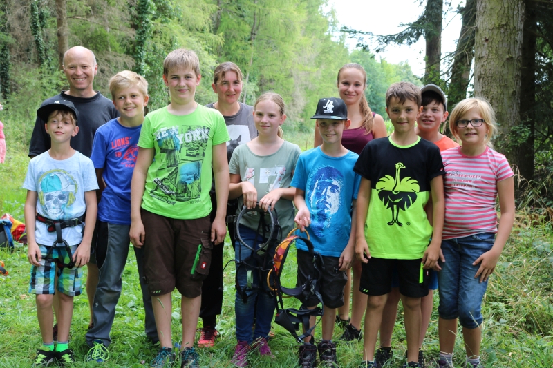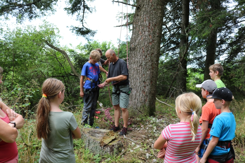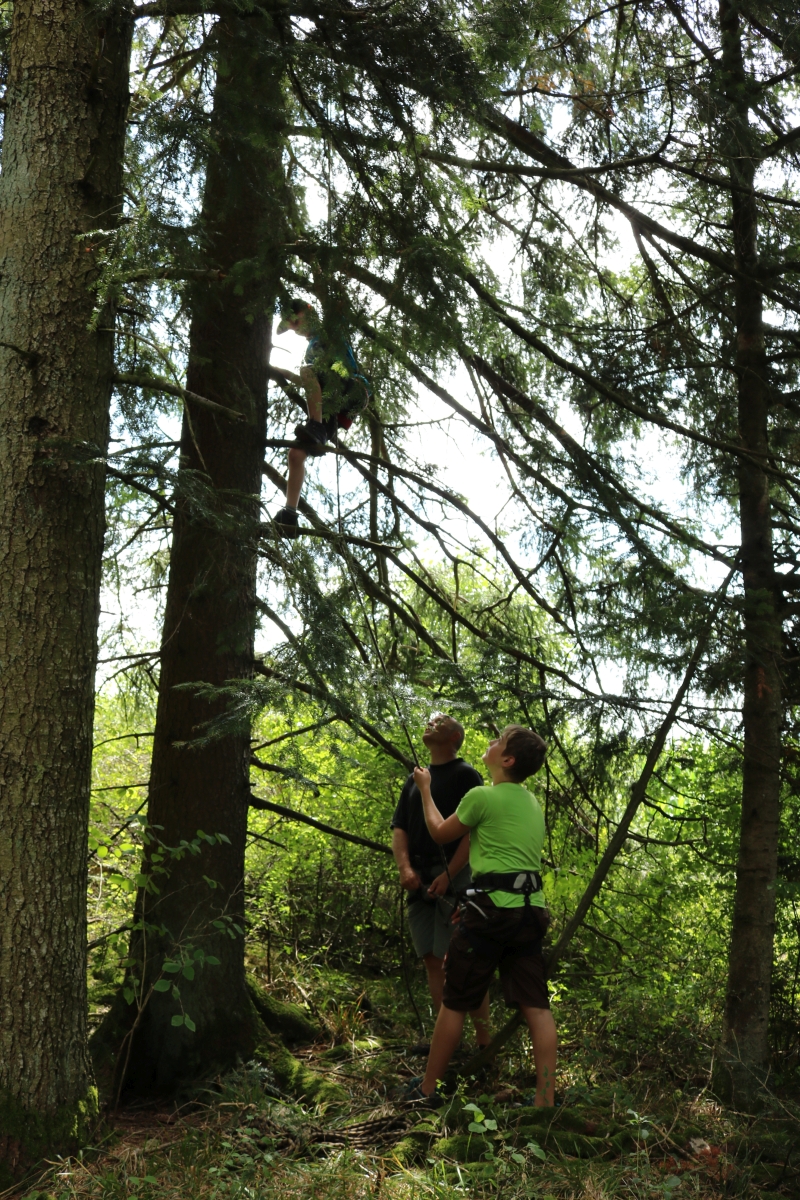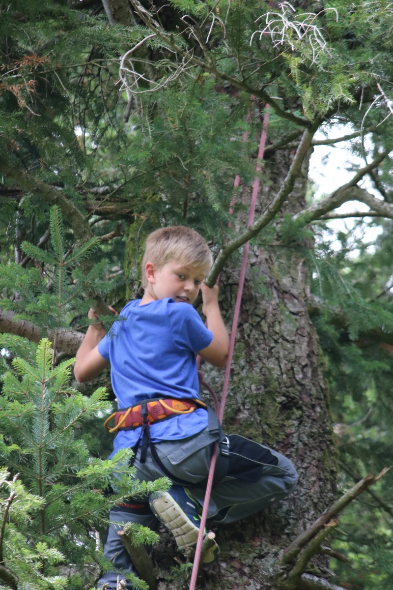 | Dieses Jahr beim Sulzer Ferienspaß neu dabei ist der Ort Dürrenmettstetten. Und mit zehn angebotenen Programmpunkten ist jede Menge Spaß und Abwechslung während der Ferienzeit garantiert. Zur ersten Aktivität, dem Baumklettern, hatten sich zwei Mädchen und sechs Jungen angemeldet. Nach einem kleinen Fußmarsch in den Hartwald gelangten sie zu drei Bäumen, die Thomas Weisser, Jugendleiter beim Deutschen Alpenverein in Oberndorf, vorab ausgesucht und die er jeweils mit einem Seil für die jungen Kletterer hergerichtet hatte. Nach einer kurzen Anleitung durch den langjährigen Kletterer konnten die ersten drei Freiwilligen in den Klettergurt steigen und Helga Weisser, sowie Hanna Weisser prüften penibel, ob alles gut sitzt und vor allem richtig gesichert ist. Thomas erklärte den Doppel Achterknoten, mit dem sich ein Kletterer ins Seil einbindet. Und schon konnten sich die ersten drei Kletterer an „ihrem“ Baum hochangeln. „Steig auf den Ast und bleib ganz nah am Baum“, solche helfenden Instruktionen waren bei den Jugendlichen im Alter zwischen neun und zwölf Jahren kaum nötig, so schnell waren sie zwischen den dichten Zweigen verschwunden. Trotz allem jederzeit gut gesichert von Thomas, Helga und Hanna. Zwischendurch ruft Helga immer mal wieder hoch: „Fühlst du dich wohl?“ Gleich darauf die prompte Antwort: „Ja“. Abseilen geht ebenfalls ruckzuck, die Kinder können sich in den Gurt reinsetzen und der Sicherer, der unten am Baum steht, lässt den Kletterer langsam hinab. „Der Ausblick ist cool, einen ganzen Maisacker und noch darüber hinaus hab ich gesehen“, schwärmt Florian, der gerade die rund zwanzig Meter hohe Tanne herunter gekommen ist. Ein anderer ruft: „Ich will noch den Ausblick genießen“. „Kein Problem“, antwortet Helga lächelnd, „lass dir Zeit, ich hab dich gesichert“. Die abschließende Meinung der Mädchen und Jungen war eindeutig, „Es hat sehr viel Spaß gemacht“. Da war auch der eine oder andere Kratzer am Arm oder Bein ganz unwichtig. |