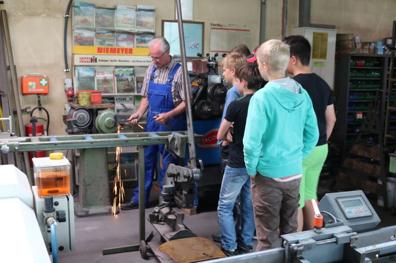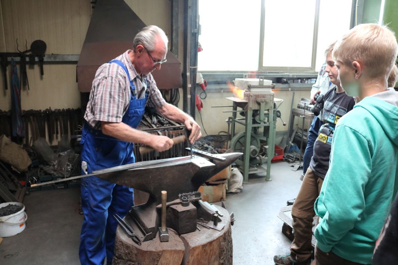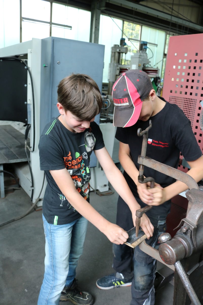 | Wer weiß, vielleicht hat dieser Ferienspaß-Nachmittag in der Kunst-Schmiede in Dürrenmettstetten bei dem einen oder anderen Jungen das Interesse geweckt, später einmal den Beruf des Metallbauers zu erlernen. Fakt war jedenfalls, dass sich nur Buben zu diesem Angebot angemeldet hatten. Und diese wurden von Rudolf Schmid, dem Seniorchef, gleich in das spannende Metallhandwerk eingeführt. Der Rohstoff Eisen komme längst nicht mehr aus den mittlerweile erschöpften deutschen Erzgruben, sondern aus Übersee. Im Hochofen erhitzt, wird daraus Roheisen oder auch Gusseisen, das einen Kohlenstoffanteil von zwei bis vier Prozent aufweist, spröde ist und sehr leicht bricht. Gebe man bei der Eisenschmelze reinen Sauerstoff hinzu, verbrenne der Kohlenstoff und es entstehe Stahl. „Baustahl mit einem Anteil von 0,2 Prozent Kohlenstoff verarbeiten wir hier in der Werkstatt“, erklärt der Schmiedemeister den sechs jungen Zuhörern. Brüchigkeit und Schmiedbarkeit zeigte Rudolf Schmid anhand zweier rot glühenden Eisenstangenspitzen, die er am Amboss bearbeitete. In der Werkhalle steht neben dem großen Schmiedehammer immer noch die alte Esse, an der schon sein Vater gearbeitet hatte. Das Eisen werde heute aber im gasbetriebenen Ofen erhitzt. Hier erreiche man eine konstante Temperatur von 1250 Grad, in der Esse würden bis zu 1800 Grad erreicht, wobei der Stahl leicht verbrennen könne. Früher war der Schmied eng verbunden mit dem dörflichen Leben. Nicht nur Pferdehufe – in Dürrenmettstetten gab es damals rund siebzig Pferde - mussten beschlagen werden, sondern auch die der Kühe und Ochsen, wusste Schmid zu berichten. Allerlei Metallstücke zum Anfassen hatte er auf dem Werktisch vorbereitet und zu allen wusste der Schmiedemeister zahlreiche Details. Auch in die verschiedenen Schweißarten gab es für die Ferienspaß-Kinder einen Einblick. Das „Magische Hufeisen“ hatten die Jungs jedenfalls, nach kleiner Hilfestellung durch Hannelore Schmid, bald durchschaut. |
