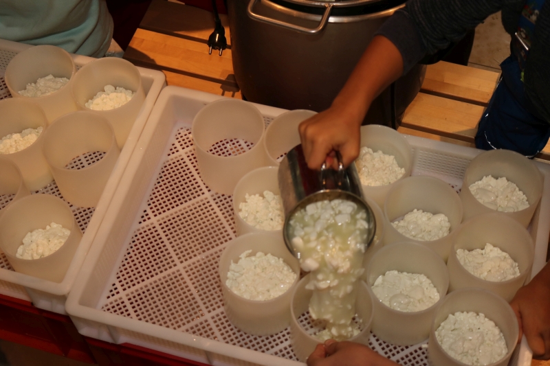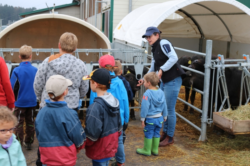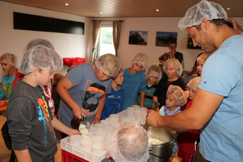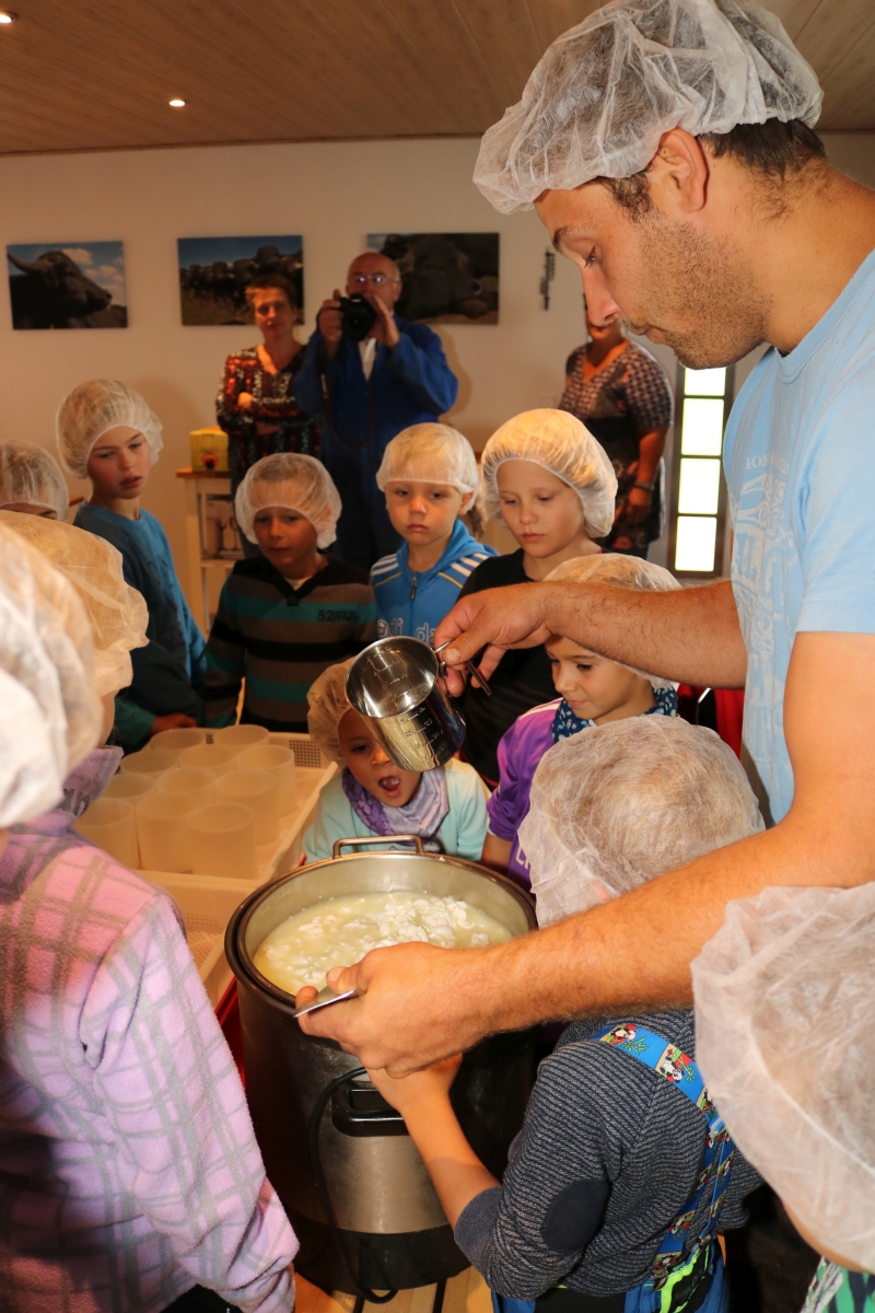 | Recht früh aufstehen mussten die Ferienspaß-Kinder, damit die vielen Wasserbüffel und -Kälbchen im Stall von Markus und Tatjana Steinwand ihr Futter bekamen. Aber nach einem leckeren Frühstück durfte jeder sich seinen eigenen Käse herstellen. Mancher von den 18 Kindern kann ein Gähnen nicht unterdrücken, doch es hilft nichts, „die Tiere bekommen zuallererst etwas zu fressen, bevor wir frühstücken können“ sagt Tatjana Steinwand schmunzelnd. Doch kaum hat Markus Steinwand erklärt, wie das Heu zu den Tieren geschoben werden muss, springen die ersten auch schon los – und die wartenden Büffel können es sich schmecken lassen. In zwei Gruppen aufgeteilt geht es anschließend mit Stefan Steinwand in den Melkstand. Dort schauen die Jungs und Mädchen interessiert zu, wie er die Melkanlage an das Euter der Mutterkühe anschließt. Die Kühe kennen den täglichen Melkprozess bestens und laufen selbstständig gemächlich in den Melkstand. Eine digitale Anzeige an jeder Absauganlage informiert den Melker über den Milchfluss und die Menge der abgesaugten Milch, die zum Abkühlen direkt in einen großen Tank gepumpt wird. Draußen warten die Büffelkälbchen schon sehnsüchtig auf ihre Mahlzeit – das ist der „Kälberchor“ wie Markus Steinwand lachend meint - und die Vier- bis Zwölfjährigen bringen eifrig mit dem „Milchtaxi“ jedem einen Eimer Milch, der in Minutenschnelle leergesaugt wird. Jedes Kälbchen wird ausgiebig gekrault und gestreichelt. Lustig ist es wenn das Kalb an den Fingern saugt, „ihr braucht keine Angst haben, die haben noch nicht alle Zähne“, ruft Tatjana Steinwand lachend. „Habt ihr schon die blaurote Zunge bei den Büffelkälbchen gesehen? Die wird dann immer dunkler, je älter der Büffel wird“, erklärt sie. Und dann endlich, gibt’s auch für die Kinder Frühstück, das Marion Pfau im Besucherraum schon hergerichtet hat. Der Clou ist, dass die eben gemolkene Milch nun als leckeres Schokogetränk getrunken werden kann. Die Kinder lassen sich auch Müsli, Laugenstange, Marmelade, Wurst und Obst schmecken. Durch die frische Luft ist nun auch wirklich jeder wach geworden und die Zeit ist wie im Flug vergangen. Nachdem auch die Brüder Markus und Stefan Steinwand gefrühstückt haben, steht nun der Käserei nichts mehr im Weg. „Alle waschen sich die Händen und setzen den „Käsehut“ (ein weißes Schutzhäubchen) auf“, ruft Markus Steinwand und bald scharen sich alle um den großen Kessel, in dem er die frische Büffelmilch schon vorbereitet hat. „Für die Herstellung von Käse braucht man Lab“, erklärt der Landwirt den Kindern. „So kann die Milch länger „aufbewahrt“ werden“. Alle schauen interessiert zu, wie er mit der „Käseharfe“ die Milch immer wieder zerschneidet. „Und jetzt fleißig rühren, damit sich die Molke aus den Milchstückchen presst und ihr einen schönen Weichkäse bekommt“ zeigt er den gespannten Kindern. Ganz klar, dass jeder mal rühren will. Dann ist es soweit: Mit einer Schöpfkanne füllen die Ferienspaß-Kinder den frischen Käse in Förmchen ab, die Molke fließt unten wieder heraus und wird aufgefangen. Danach wendet Markus Steinwand die Förmchen noch ein paar Mal, sodass sich der Weichkäse etwas verfestigt. „Probiert mal die Molke, die schmeckt ganz süß“ fordert Steinwand die Kinder auf. Zuerst zögernd, dann aber überzeugt, trinken die Kids gerne ihr Glas mit der süßen Molke leer. „Zuhause könnt ihr den Käse aufs Brot legen und entweder mit Marmelade oder ein bisschen Salz verfeinern“ gibt der Büffellandwirt noch als Tipp mit, bevor die ersten Eltern schon auf den Hof fahren, um ihre Kinder abzuholen. Der Vormittag ging viel zu schnell vorbei, doch als Erinnerung dürfte jeder einen Hauch von frischem Stallduft mit nach Hause gebracht haben. |