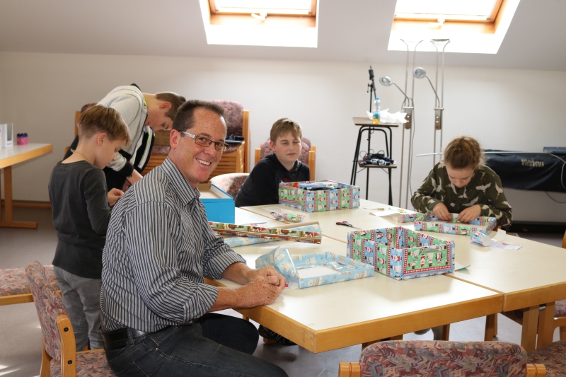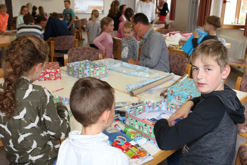 | Die zahlreichen Dürrenmettstetter Kinderkirchkinder, die Mitarbeiter und Pfarrer Ole Dost (rechts) packen fleißig Weihnachtspäckchen für albanische Kinder. |