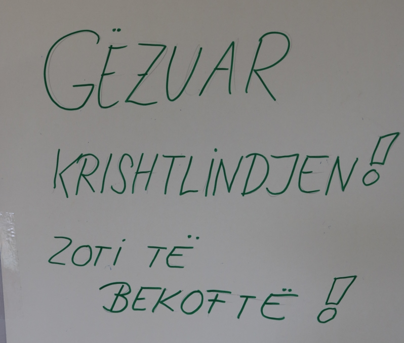| In jedes Päckchen legten die Kinder eine Karte mit diesem Satz, der "Wunderschöne Weihnachten - Gott segne dich" bedeutet. |