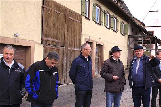 Landrat Wolf-Rüdiger Michel (Vierter von links) machte sich am Donnerstag in Dürrenmettstetten ein Bild von dem Areal, auf dem das neue Dorfgemeinschaftshaus entstehen soll. Dazu sollen der ehemalige Farrenstall und das Haus Eberhardt, vor dem die Gruppe steht, abgerissen werden, so dass vor der Kirche ein freier Platz entsteht. Von links: Die Ortschaftsräte Karl Wössner und Siegfried Dölker, Bürgermeister Gerd Hieber, Ortsvorsteher Robert Trautwein und Pfarrer Wolfgang Müller. Bild: kpd
