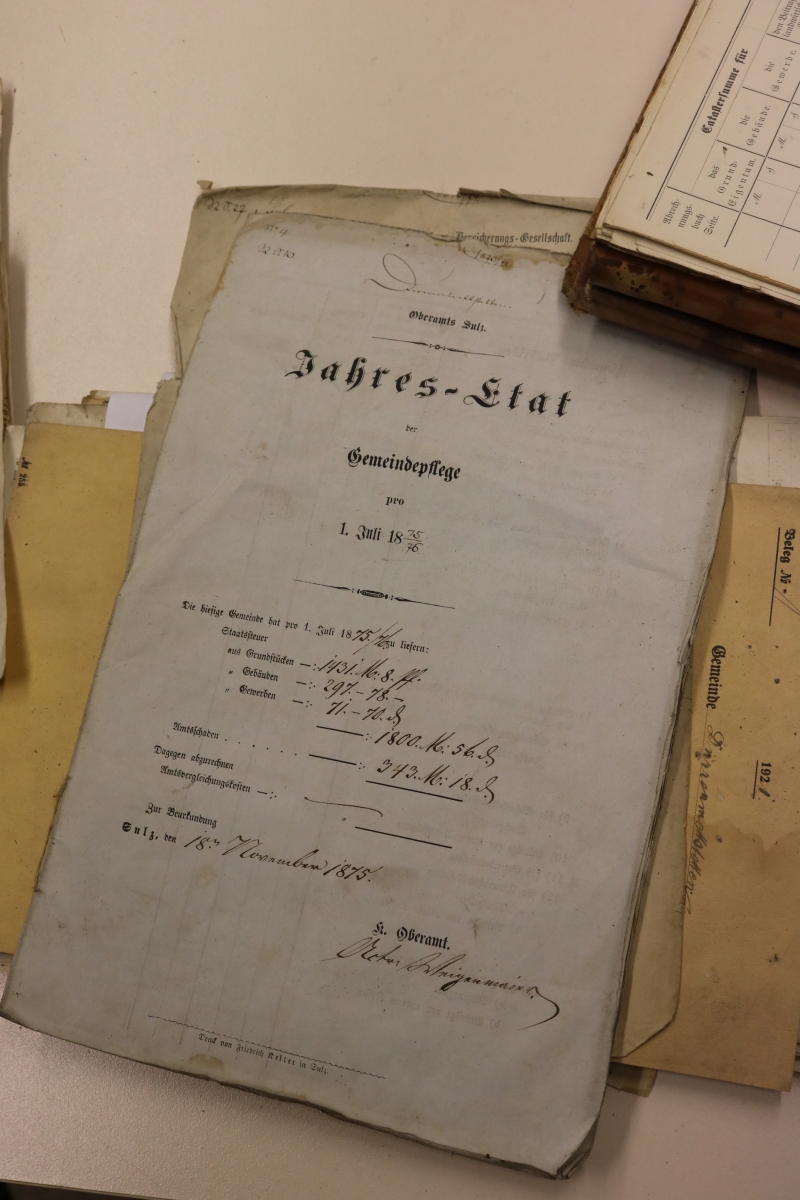 | Zeit scheint für die ehrenamtlich Tätigen im Dürrenmettstetter Archivraum kein Thema zu sein. Nicht nur die Wanduhr ist - sprichwörtlich - stehen geblieben, sondern die fleißigen Helfer Sigrid Steinwand, Hilde Kreidler, Elisabeth Huß und Bernd Ade haben schon gute 600 Stunden damit verbracht, die teils über zweihundert Jahre alten Dokumente genauestens zu archivieren. Im früheren Sitzungssaal des Rathauses und jetzigem Archivraum steht der Computer, in dem die Dokumente akribisch mittels eines speziellen Programmes erfasst werden und an den Wänden reihen sich n Regalen die Aktenbündel. Auf dem Tisch in der Mitte des Raumes liegen die alten Schriften verteilt und werden gesichtet. Vieles muss regelrecht abgesaugt und so vom Schmutz befreit werden. „Beim Einmarsch hätten die Franzosen alles in den Dreck geworfen“, kann Sigrid Steinwand von Überlieferungen berichten, „manches Mal sieht man noch einen Schuhabdruck auf dem Papier“. Mit dem Inhalt der Sachbücher könnten sie sich gar nicht richtig befassen, so riesig sei die Menge, die es zu sortieren gelte, so Bernd Ade. Aber manches Mal sei es doch spannend, was in der alten Sütterlinschrift aufgeschrieben wurde. Da könne dann oft Hilde Kreidler bei der Entzifferung aushelfen, sagt Sigrid Steinwand. Einmal pro Woche treffen sich die Ehrenamtlichen im Rathaus, dann wird rund drei Stunden lang sortiert und erfasst. Grund genug für Ortsvorsteher Robert Trautwein, der zusammen mit ein paar Ortschaftsräten Einblick in die Archivarbeit nahm, den Helfern zu danken. Jedem überreichte er eine Flasche Sulzer Sekt samt Sulzer Pralinen. Seine Hoffnung sei, dass das Team noch lange an der Archivierung der Dürrenmettstetter Dokumente dran bleiben könne. |
