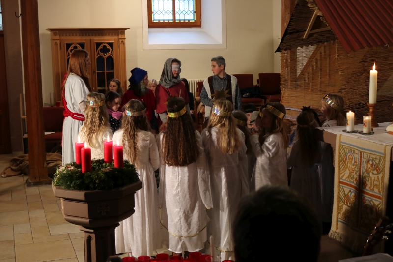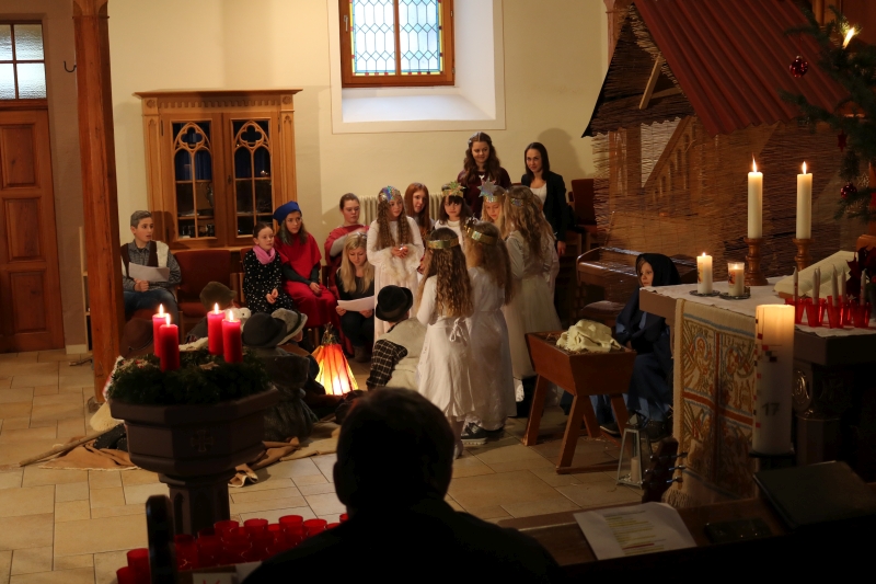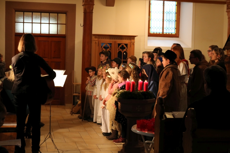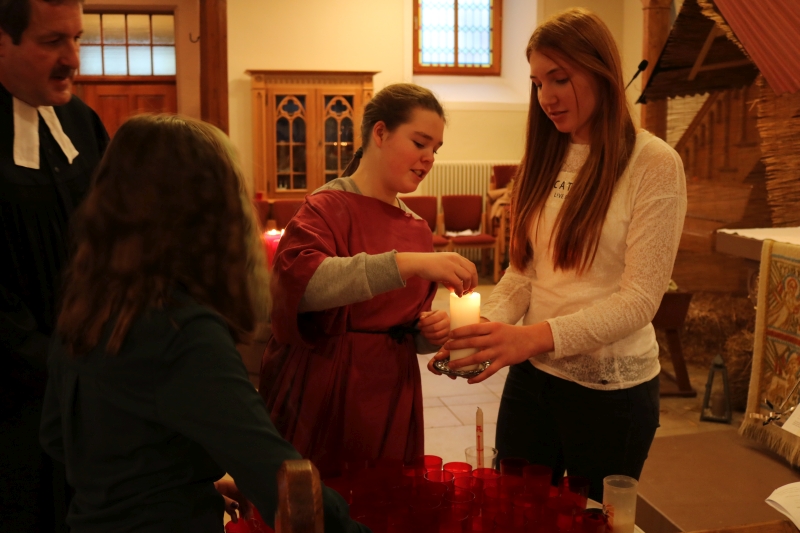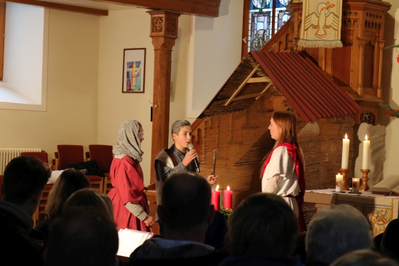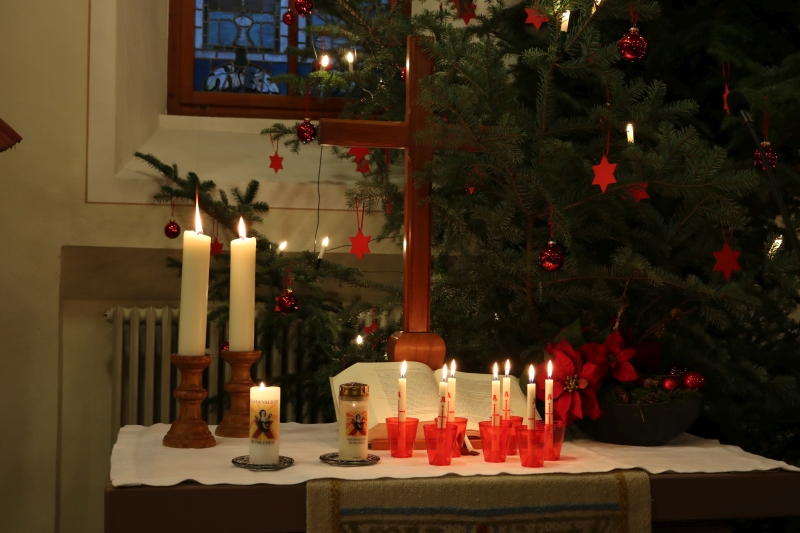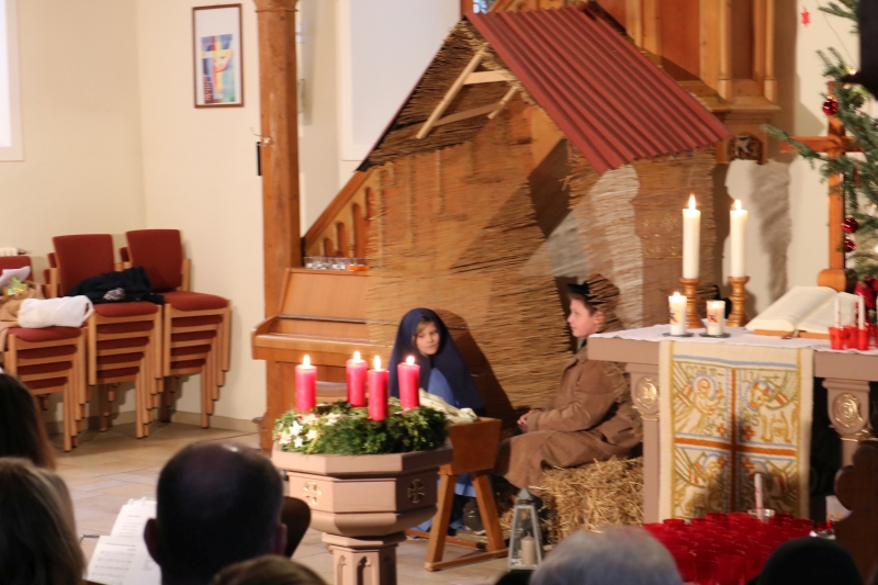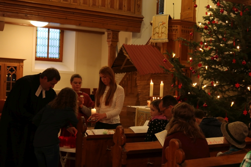 | Das Friedenslicht, in Jerusalem entzündet und von den Pfadfindern bis nach Dürrenmettstetten geholt, wurde an alle Gottesdienstbesucher am Heilig Abend verteilt. Von diesem Licht der Befreiung aus aller Angst sprach Pfarrer Wolfgang Müller in seiner Predigt und dass sich daran alle Christen erfreuen dürfen. Die Kinderkirchkinder erzählten mit einem schönen Singspiel die Geschichte von Jesus Geburt in einer Scheune in Bethlehem. Die großen und kleinen Sänger ließen abschließend ein fröhliches „Du lieber Himmel, du großer Gott kommst in unsere Welt“ erklingen. |