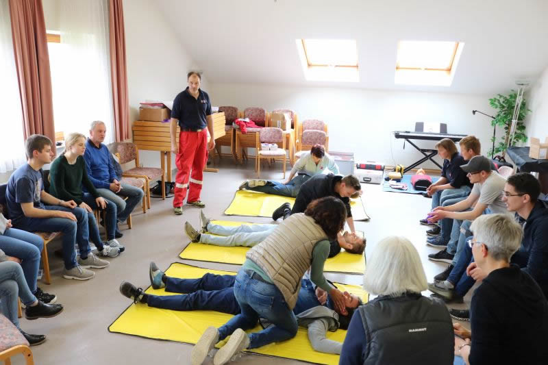 | Teils um die Kenntnisse wiederaufzufrischen, teils weil der Kurs zum Erwerb eines Führerscheins benötigt wird, organisierten die Dürrenmettstetter Pfadfinder auf Anregung der „VCP-Oldies“ kürzlich einen Erste-Hilfe-Kurs. Vom DRK Sulz-Nord waren die Ersthelfer Helga Weisser aus Dürrenmettstetten und Sascha Wörner aus Hopfau als Ausbilder in der Gemeindehalle vor Ort. 17 Teilnehmer lernten in praxisnahen Übungen die lebensrettenden Sofortmaßnahmen, anschaulich von Sascha Wörner vorab demonstriert. Besonnen und ruhig in brenzligen Situationen bleiben ist nicht einfach, mahnte Wörner, doch überaus wichtig. „Bei der Reanimation drückt ihr 30 Mal mittig auf das Brustbein, beatmet den Patient 2 Mal und das solange, bis der Rettungsdienst kommt“, hieß es vom Ausbilder. Von morgens bis zum Spätnachmittag, eine kleine Mittagspause inbegriffen, lernten so die Teilnehmer nochmals das ganze Spektrum der Ersten Hilfe anhand verschiedener Situationen, um am Ende ihre Bescheinigung zu erhalten. |