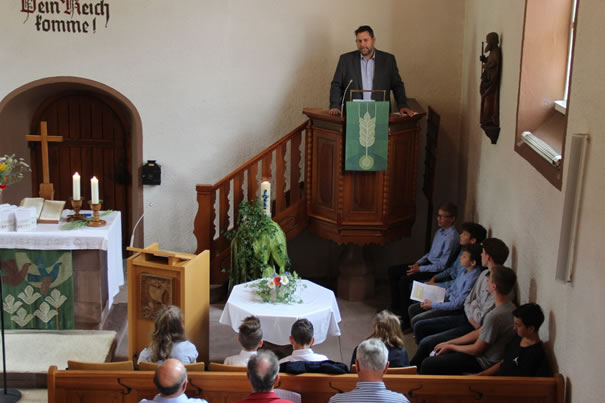 | Nicht wie vorgesehen am Glatttalstrand, sondern wegen des Wetters in der Katharinenkirche in Hopfau fand der Gottesdienst im Grünen und die Erntebittstunde der Gesamtkirchengemeinde Hopfau-Dürrenmettstetten am vergangenen Sonntag statt. Der Gottesdienst war trotzdem eine „Premiere“, wie Pfarrer Wolfgang Müller es ausdrückte, denn Landesreferent für Kirche im Grünen, Diakon Markus Munzinger, feierte den Gottesdienst mit der Gemeinde. Musikalisch umrahmt wurde er vom Posaunenchor Hopfau-Dürrenmettstetten und dem Gesamtkirchenchor. Die zehn neuen Konfirmanden, die im Rahmen dieses besonderen Gottesdienstes ihre Konfirmandenbibel erhielten, hatten sich ein Spiel ausgedacht: Die Gemeinde konnte fast alle Fragen zu ihrer Konfirmandengruppe richtig beantworten – eine „Spitzengemeinde“, wie sie schlussfolgerten. In der Predigt sprach Landesreferent Munzinger den Klimawandel an und verdeutlichte, dass Gott die Schöpfung erhalte und dauerhaft Leben möglich mache. Darum sei es Gnade, wenn etwas wächst und deshalb sei die Bitte um eine gute Ernte wichtig. Diese nahmen die Konfirmanden in ihre Fürbitten auf. Im Anschluss an den Gottesdienst wurde zum Ständerling auf dem Dorfplatz eingeladen. |