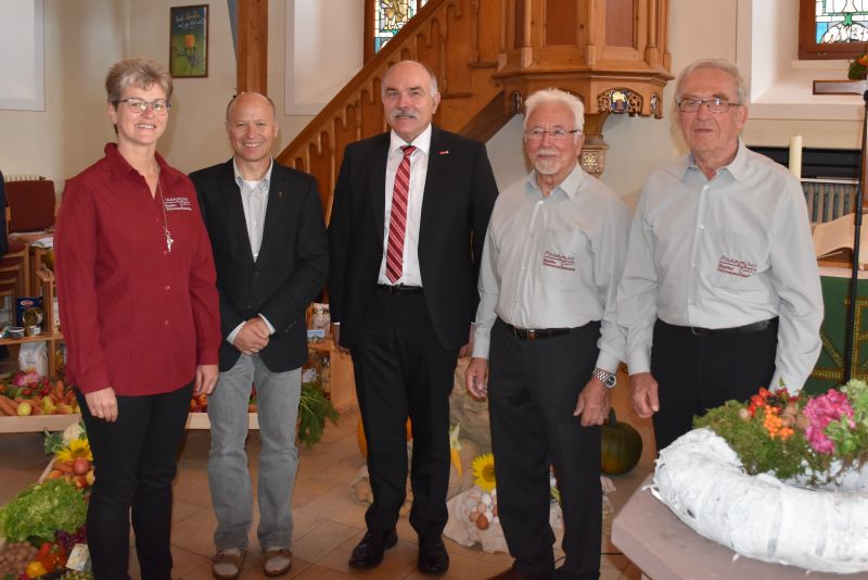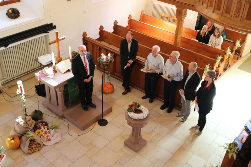 | Ein ganz besonderes Erntedankfest wurde am Sonntag in Dürrenmettstetten gefeiert: Der Posaunenchor wurde 60 Jahre alt. Zu diesem Anlass wurden die Gottesdienstbesucher mit einem musikalischen Vorspiel der Bläser begrüßt, während Bilder aus älterer und jüngerer Vergangenheit des Chores gezeigt wurden. Ein wahrer Blickfang war das Arrangement der Erntegaben in Kreuzform, das die Mesnerin Jasmin Huß zusammen mit ihren Helfern hergerichtet hatte. Die Erntegaben und das Opfer werden an den Oberndorfer Tafelladen gegeben. Pfarrer Wolfgang Müller, der den Gottesdienst mit der Gemeinde feierte, machte in seiner Predigt deutlich, dass die Dankbarkeit für diese Gaben verloren gegangen und heutzutage alles selbstverständlich sei – auch, dass es in Dürrenmettstetten einen Posaunenchor gebe. Deshalb brauche man „Menschen, die sich von Gottes Geist als lebendige Steine in das Haus Gottes einfügen lassen“, so Müller. Dankbar kann der Posaunenchor vor allem für Mitglieder sein, die lange dabei sind, so wie Hans Steinwand und Kurt Maier. Die beiden Gründungsmitglieder wurden für 60 Jahre aktive Mitarbeit im Chor von Matthias Böhringer vom Fachausschuss für Posaunenarbeit geehrt, der in seinem Grußwort an die Geschichte von der Einnahme Jerichos erinnerte. Außerdem wurden Carolin Huß und Thomas Weisser für 40 Jahre Bläserdienst geehrt. Tobias Klautke blickte auf die Geschichte des Chores zurück und bedankte sich bei allen, die diese Arbeit möglich machten und machen. Der Posaunenchor schloss den Gottesdienst mit einem modernen Nachspiel; anschließend ließen sich viele Gottesdienstbesucher noch zum Stehempfang bei herrlichstem Wetter einladen. Den ganzen Tag über konnte man in der Kirche noch die Erntegaben bestaunen. |