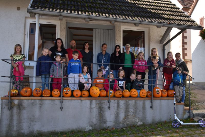 | Alle Teilnehmer und Helfer der Aktion mit den fertigen Kürbissen |