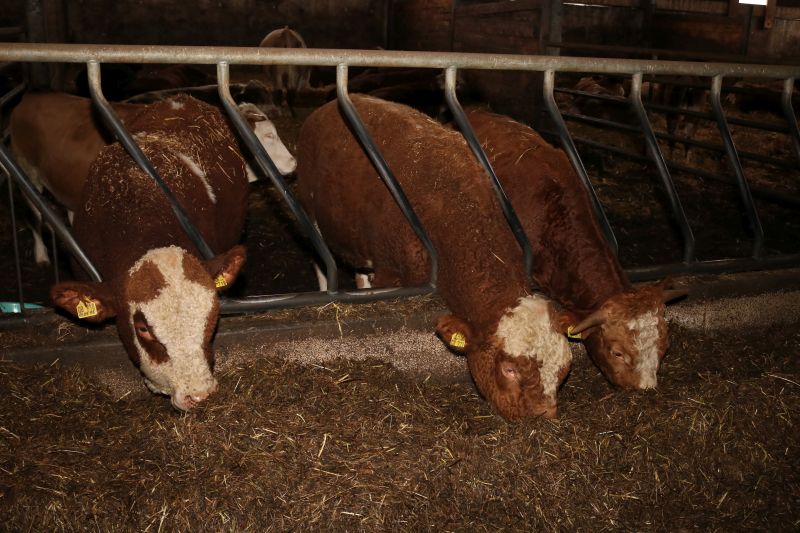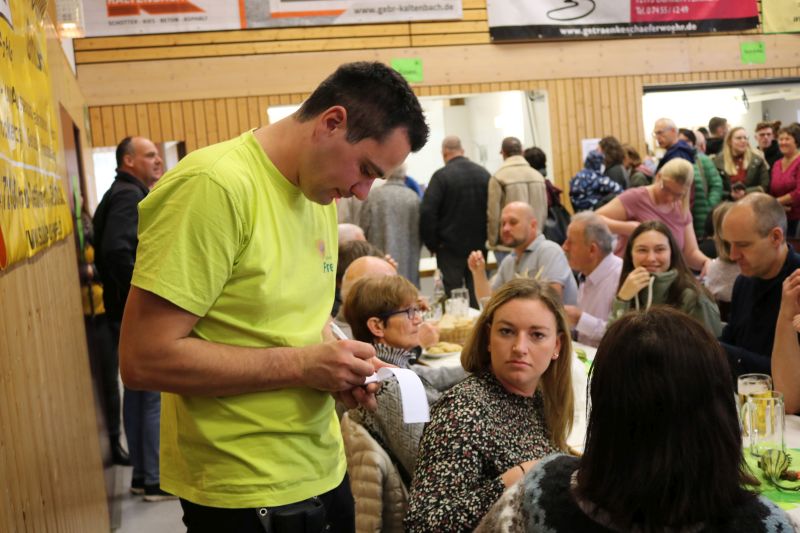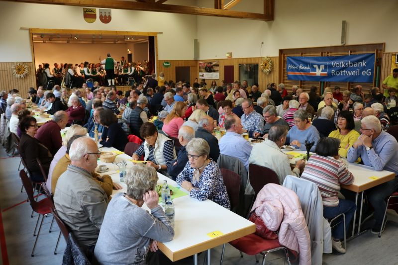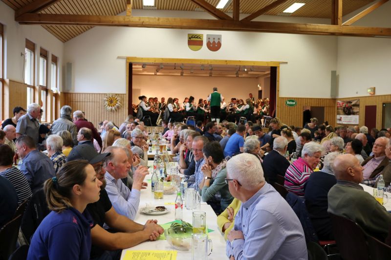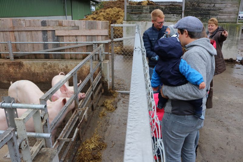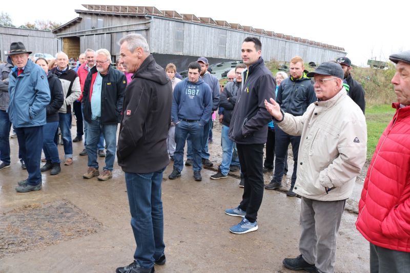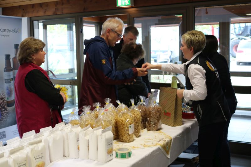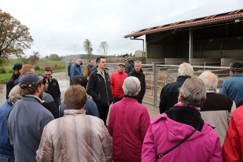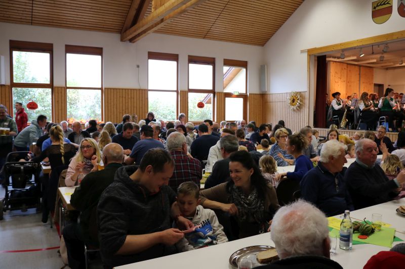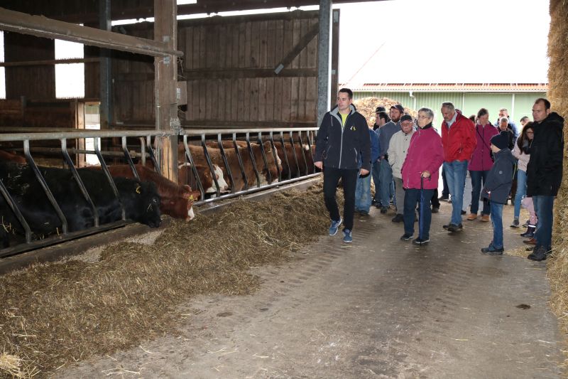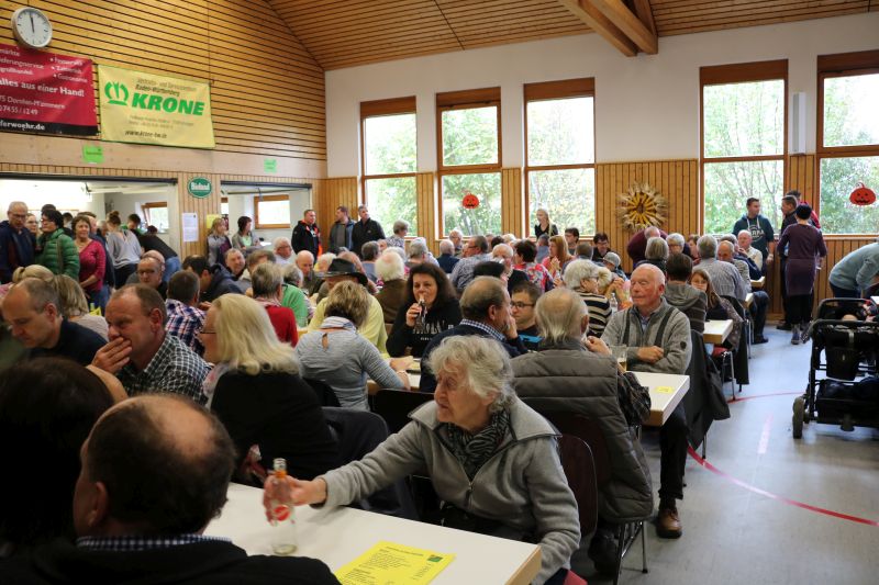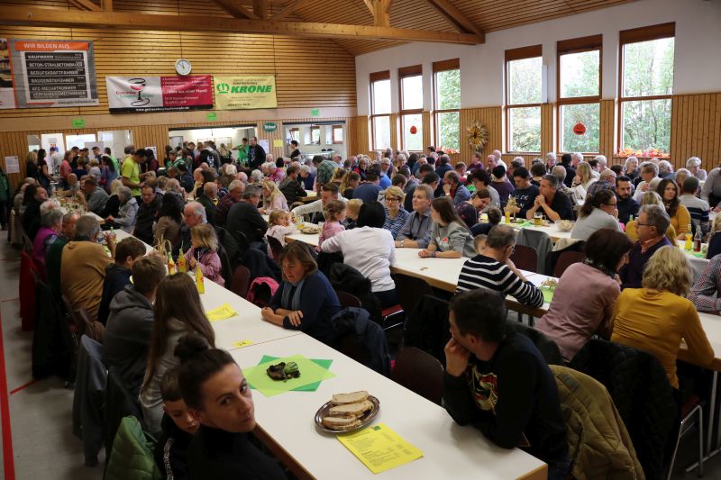 | Zur Stallbesichtigung und hausgemachten Schlachtplatte des Biolandhofes Frey kamen gestern unzählige Besucher. Erstmalig fand die Veranstaltung in der Gemeindehalle statt. Auch die Führung durch den Aussiedlerstall stieß auf großes Interesse. Zum Frühschoppen spielte der Musikverein Hopfau mit Dirigent Arne Schauer in der Gemeindehalle auf. Schon kurz vor Mittag war die Halle sehr gut gefüllt. Kurzfristig musste auch der obere Raum zur Bewirtung hergerichtet werden, so groß war der Andrang der Besucher. Deftiges aus dem Kessel oder eine feine herbstliche Kürbissuppe verwöhnten den Gaumen der Besucher. Aus der hofeigenen Backstube stammte das Bauern- und Vollkornbrot, welches laufend frisch nachgebacken wurde. Um 14 Uhr nahm Lorenz Frey rund fünfzig interessierte Besucher mit auf einen Rundgang durch den Aussiedlerstall, der nordöstlich Richtung Dettingen gelegen, seinen Standort hat. Die Umstellung zum Biolanderzeuger erfolgte vor 30 Jahren, erläuterte Frey. Anfangs habe sein Vater mit vielen Schwierigkeiten zu kämpfen gehabt. Doch für ihn, der vor zwei Jahren den Hof von seinem Vater Martin Frey übernommen hat, ist es heute eine Selbstverständlichkeit, regionale Direktvermarktung zu betreiben. Bewirtschaftet werden 80 Hektar Land, jeweils zur Hälfte Ackerbau und Grünland. Der Anbau von Lein sei eine Besonderheit. „Daraus produzieren wir das Leinöl und das Leindotteröl“, erklärt der Landwirtschaftsmeister. 80 Mastbullen werden derzeit gehalten. Angekauft werden die Tiere im Alter von acht Monaten, nach weiteren sechs bis acht Monaten werden sie geschlachtet. Das Fleisch werde über den Hofladen direkt verkauft, sowie über die rebio Erzeugergemeinschaft. Gefüttert werden die Tiere nur mit Kleegras, Heu und Silage. Die Rinder können jederzeit vom Stall auf die Weide, erklärt Frey. Die Besucher sind erstaunt, wie ruhig es im Rinderstall ist. „Daran sehe man, dass sich die Tiere wohlfühlen“, meinte eine Frau. Im Schweinestall nebenan, wo sich rund 200 Tiere aufhalten, geht es gesittet zu. Auch hier haben die Tiere einen ganzjährig offenen Zugang ins Freie. Die Schweine sind sehr reinlich, erklärte Frey den Besuchern die Aufteilung der Buchten. „Wir haben keine Spaltenboden, daher gibt es auch nicht so viel Gestank hier“, erklärt Lorenz Frey. „Wir haben hier im Aussiedlerstall praktisch eine gläserne Produktion, bei uns kann man alles anschauen“, bestätigt Frey die offene Stallhaltung. Das Futter, das alle Tiere bekommen, stammt aus eigenem Anbau. Darunter ist auch der gehaltvolle „Leinkuchen“, der als Abfallprodukt bei der Herstellung des kalt gepressten Leinöls entsteht. Der Kindergarten Dürrenmettstetten gratulierte dem Biohof Frey anschließend in der Gemeindehalle mit zwei herbstlichen Liedern und einer lustigen „tierischen“ Darstellung, wie es auf dem Bauernhof zugehen kann. Im Eingangsbereich konnten sich die Gäste mit den hofeigenen Produkten entsprechend eindecken. |