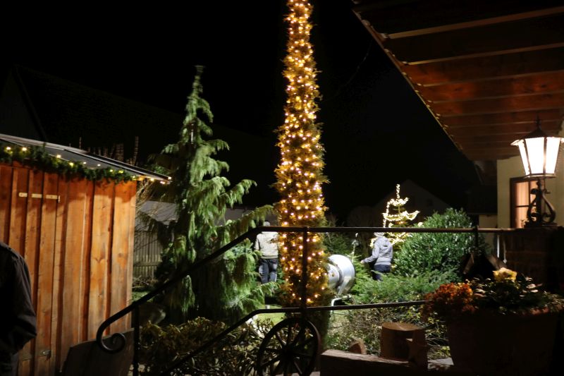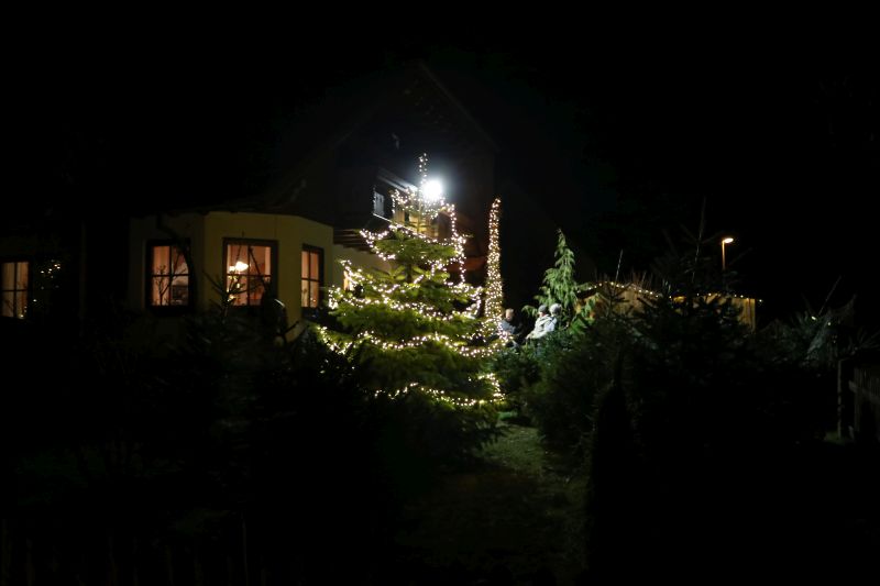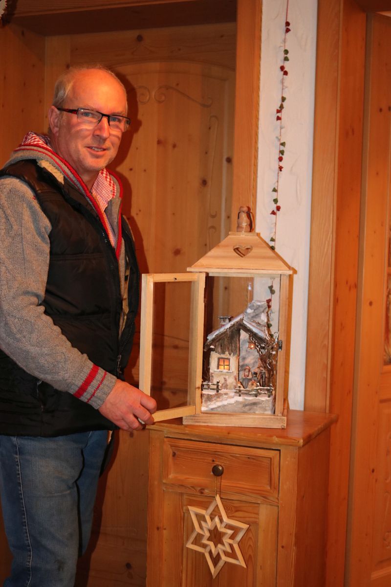 | Wie jedes Jahr öffnete Krippenbauer Ernst Jäkle seine Haustür und hieß die Besucher willkommen. In der häuslichen Umgebung ließen die zahlreichen, in handwerklicher Kunst gefertigten Weihnachtskrippen ein Gefühl des Innehaltens aufkommen. Die bis ins kleinste Detail ausgearbeiteten Kunstwerke zogen die Betrachter, jüngere und ältere gleichermaßen, in den Bann. So sieht der Betrachter in einer „Laternenkrippe“ eine verschneite Steintreppe, die mit Fußstapfen bedeckt ist. Eiszapfen hängen vom Dach herunter. Mehrere Schafe stehen vor dem geöffneten Stall, wo sich Maria und Josef über die Krippe mit dem Jesuskind beugen. Die Szene mit der Heiligen Familie wird in einer kleinen verschneiten Hütte dargestellt, die sich wiederum in einer Holzlaterne befindet. Jede noch so kleine Einzelheit wirkt hierbei äußerst lebensecht. Stolz präsentierte Ernst Jäkle diese Krippen-Besonderheit. Vor dem Haus zogen Brat- und Glühweindüfte durch den Garten, in dem Weihnachtsbäume zum Verkauf standen. Ein reger Besucherstrom trotzte dem nasskalten Winterwetter und ließ sich manch Köstlichkeit schmecken. Am Sonntag wurden sie dazu noch von den Alphornbläsern aus Dornhan musikalisch unterhalten. |